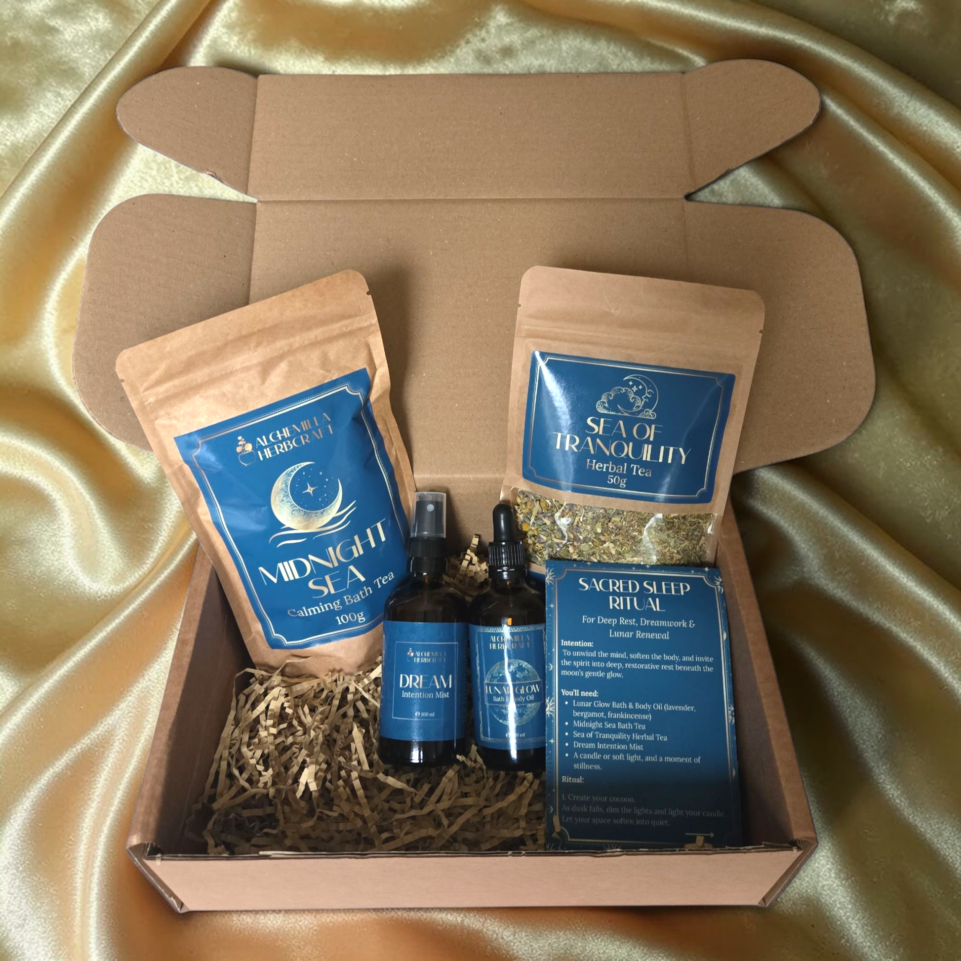 Sacred Sleep is an Irish-made nighttime self-care ritual bundle designed to help you unwind, release, and settle into deep, restorative rest. Featuring a soothing herbal tea, a luxurious bath and body oil, a dreamy intention mist, and a tranquil botanical bath soak — each element works in harmony to create a peaceful nighttime sanctuary.